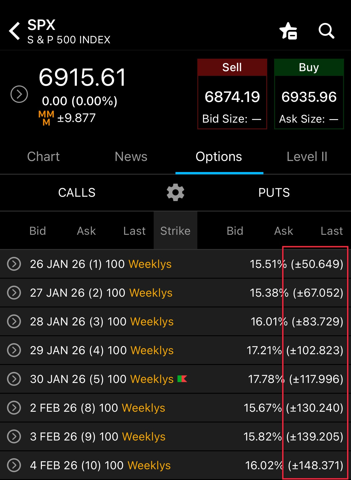 In the image above, the highlighted zone is the markets expected move based on options pricing from today until that day’s expiration.