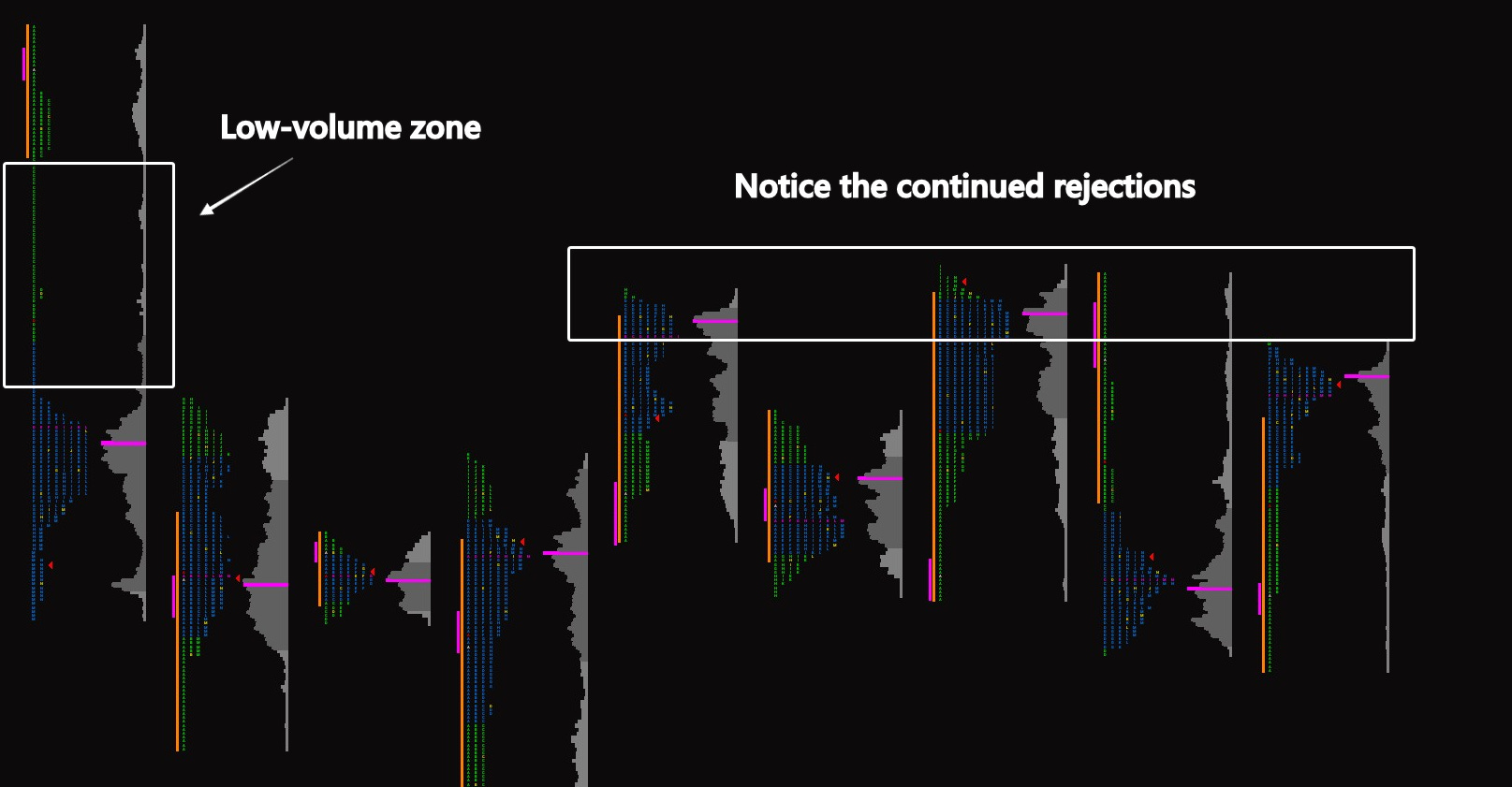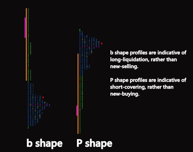 In Volume Profile, you’ll often see thin volume at the extreme compared to the body of the distribution.