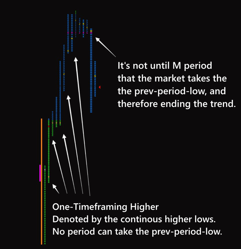 When a market one-timeframes higher, each subsequent period makes a higher low.